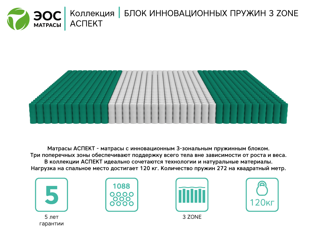 В коллекции «Аспект» представлены матрасы нового поколения с инновационным 3-зональным пружинным блоком. Три поперечные зоны обеспечат поддержку тела вне зависимости от роста и веса. В коллекции идеально сочетаются передовые технологии и натуральные материалы, чтобы каждый смог насладиться правильным спальным местом и здоровым сном.