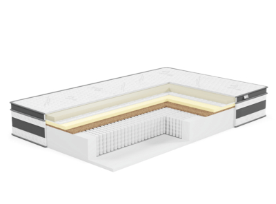 - Бескомпромиссный комфорт. Пружинный блок MultiPocket S1000 с высочайшей плотностью пружин 511 шт./м2 сочетается с настилочными слоями из латекса и кокосовой койры. Можно переворачивать матрас, меняя степень жесткости.