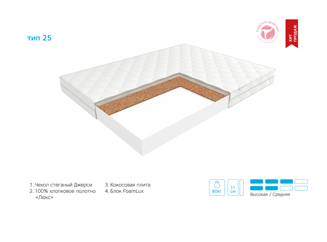 | Материалы | FoamLux (пенополиуретан), Кокосовая койра, Хлопковое полотно |