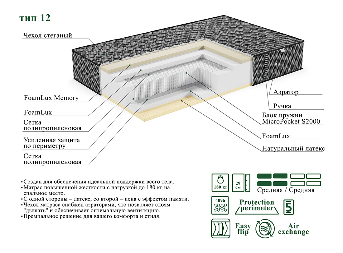 - Слой высокотехнологичной пены FoamLux не только обеспечивает превосходную вентиляцию, но и способствует поддержанию оптимального микроклимата во время сна.