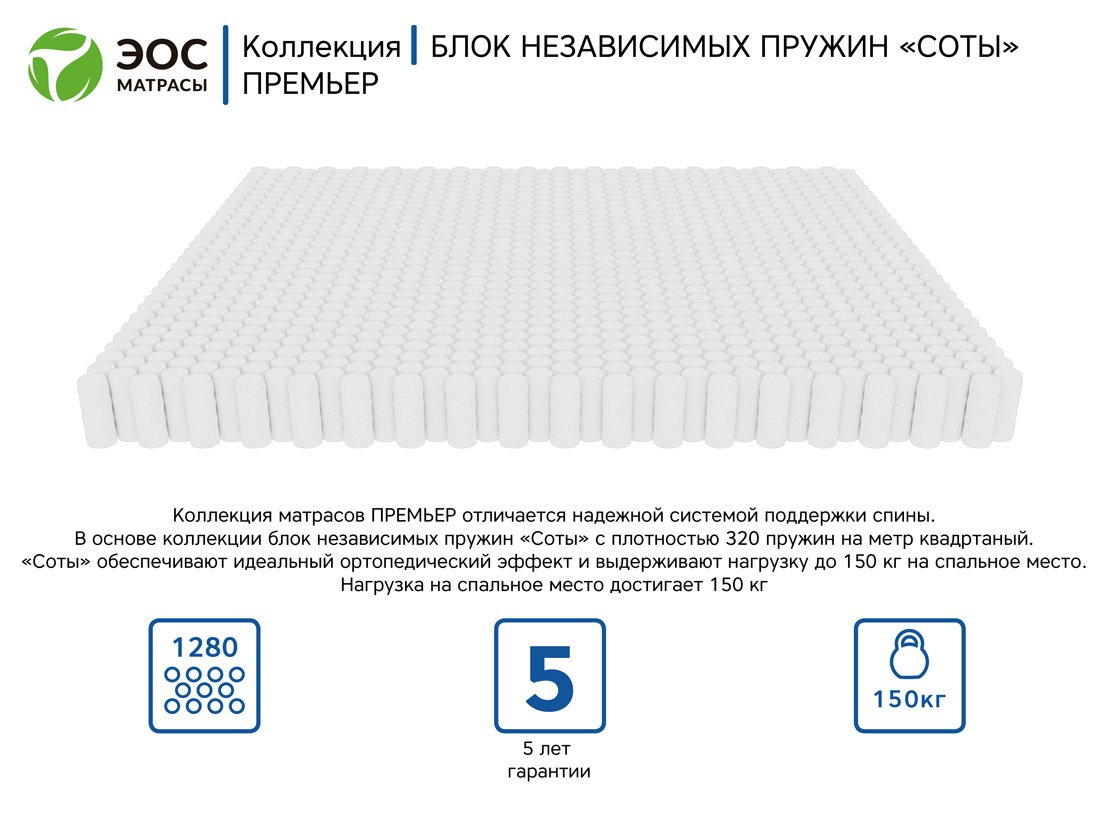 Коллекция матрасов «Премьер» отличается надёжным пружинным блоком «Соты». Количество пружин обеспечивает идеальный ортопедический эффект. В коллекции идеально сочетаются передовые технологии и натуральные материалы, чтобы каждый смог насладиться правильным спальным местом и здоровым сном. Матрас EOS Премьер 3а – это уникальное сочетание природных материалов с усиленным независимым пружинным блоком. Высокая надежность и долгий срок службы.