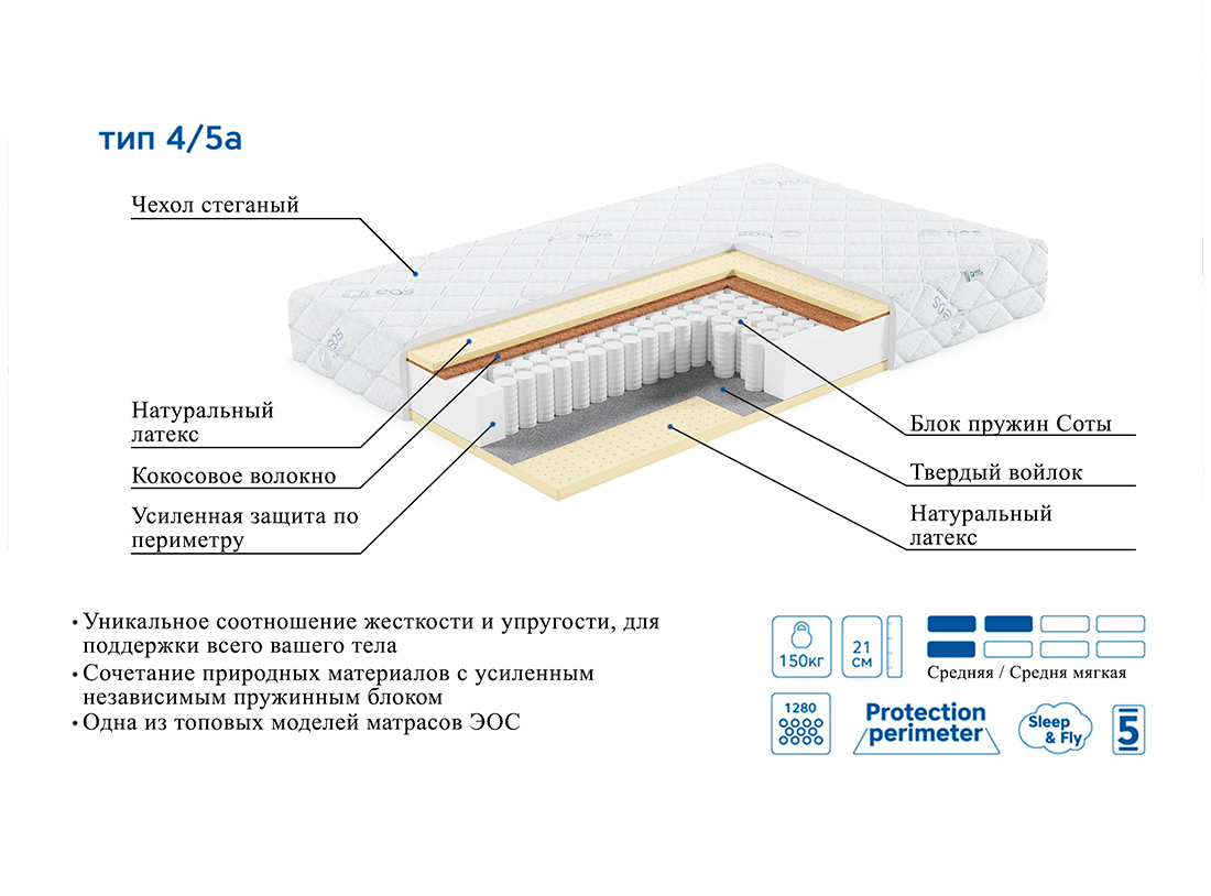 Матрас EOS Премьер 4/5а – это уникальное соотношение жесткости и упругости для поддержки всего вашего тела.