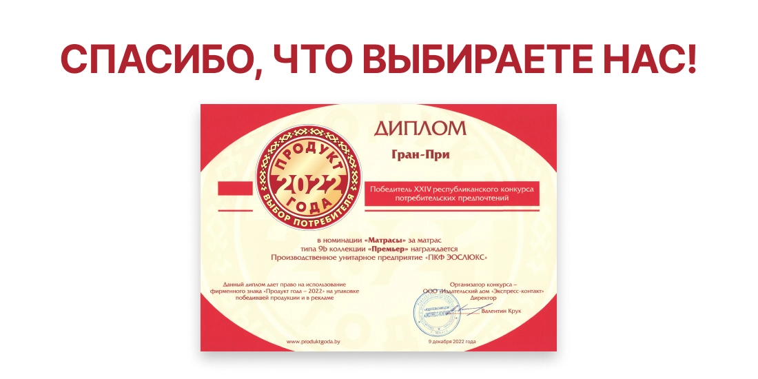 И снова в числе лучших! По итогам голосования потребителей компания ЭОС стала призёром Премии “Номер 1” в номинации “Матрасы белорусского производс...